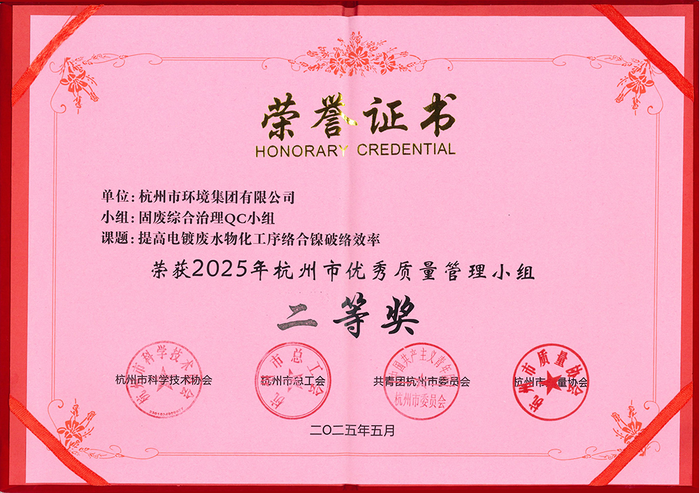 5月27日-30日,由杭州市科學(xué)技術(shù)協(xié)會(huì)、杭州市總工會(huì)、共青團(tuán)杭州市委員會(huì)和杭州市質(zhì)量協(xié)會(huì)聯(lián)合舉辦的2025年杭州市優(yōu)秀質(zhì)量管理小組成果發(fā)布會(huì)評(píng)比活動(dòng)在千島湖舉行,臨江公司固廢綜合治理QC小組成果《提高電鍍廢水物化工序絡(luò)合鎳破絡(luò)率》通過現(xiàn)場(chǎng)路演、專題匯報(bào)、專家評(píng)審答辯在近400個(gè)課題組脫穎而出,榮獲2025年杭州市優(yōu)秀質(zhì)量管理小組二等獎(jiǎng)。